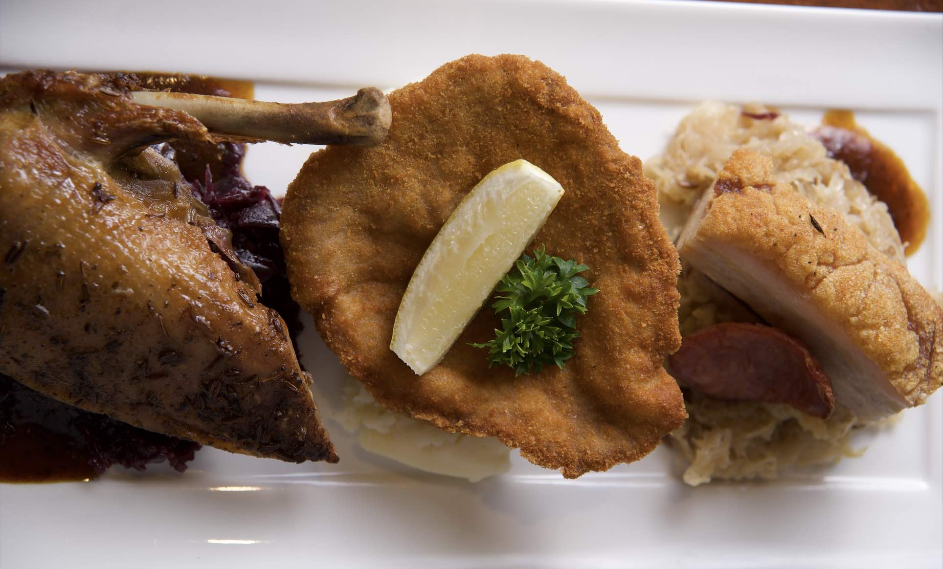 roasted duck, schnitzel, pork belly, grilled csabai sausage, sauerkraut, braised red cabbage, dumplings, mashed potatoesthe dessert includes: traditional strudel